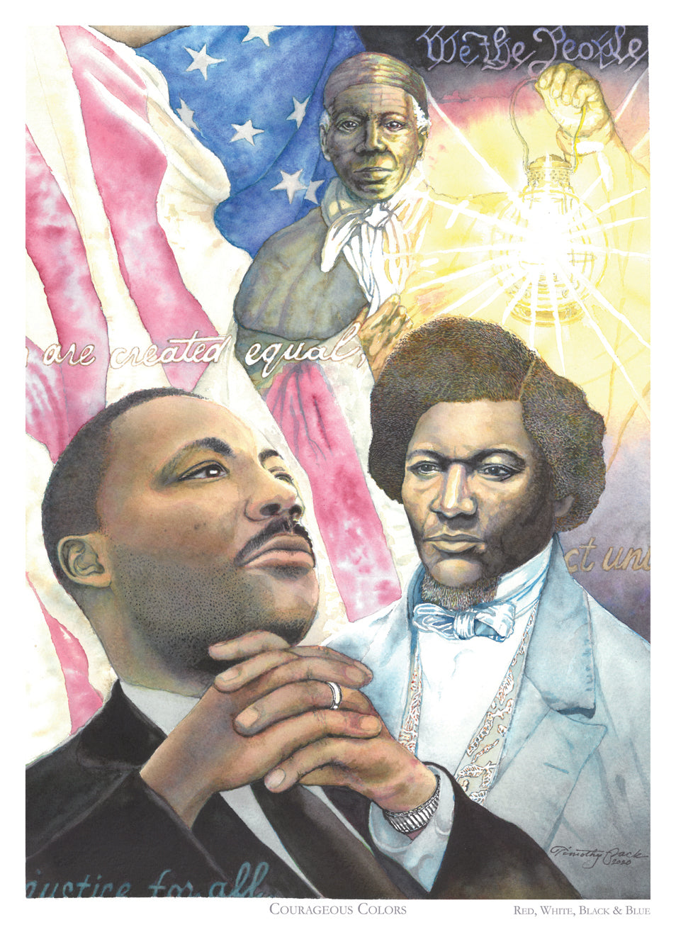 11" x 15.25" (image area) High quality print of original watercolor celebrating three courageous Americans. The painting depicts Martin Luther King, Jr., Frederick Douglass, and Harriet Tubman. These, in their times, exhibited exceptional courage in the face of oppression and hate. As Americans and as Christians, each of these strove to remind the oppressive, that neither the Bible, nor our own Constitution supports the subjugation and enslavement of people. Accordingly, phrases from these foundational truths are subtly included in the composition, yet darkened, obscured, and pushed to edges. This art is signed by the artist.